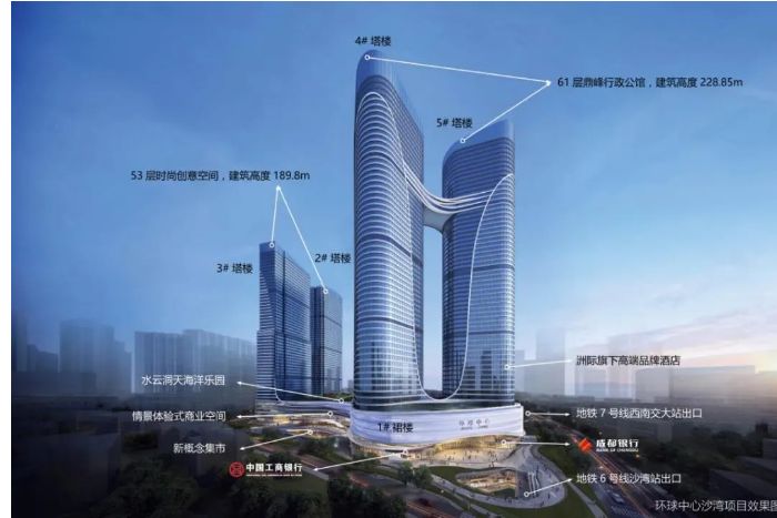 項目由3層商業(yè)裙樓(局部4層)及4棟超高層塔樓組成,最高塔樓高達243米,被譽為“摩天雙子塔,標定時代天際線”、“新世紀·成都高端峰寓范本,當代高階天幕藝術(shù)品,全球一線臻裝選材”,是成都市西北新地標建筑。