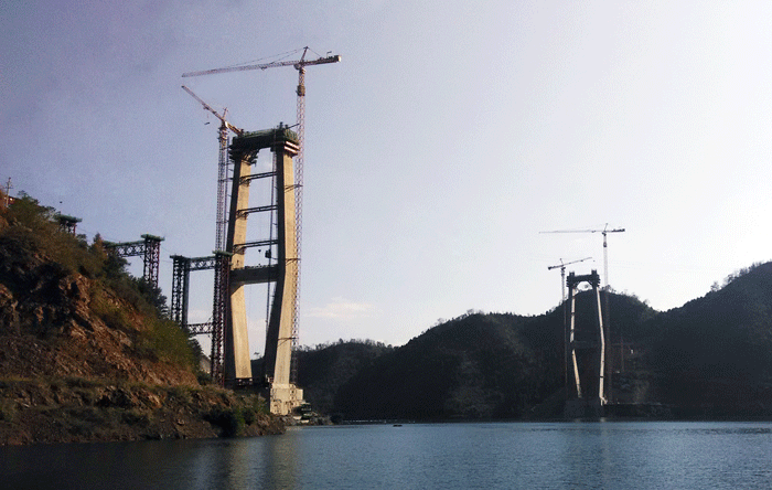 紅水河特大橋橋長956米,引橋設計為2×20米預應力混凝土現(xiàn)澆箱梁,主橋設計為貴州岸邊跨213米,主跨508米,廣西岸邊跨185米的雙塔雙索面混合式疊合梁斜拉橋,結(jié)構(gòu)設計形式新穎。橋面寬27.7m,為雙向四車道高速公路。設計速度每小時80公里,總投資5.46億元,由廣西路橋公司承建。大橋在施工中利用斜拉橋主塔本身安裝纜索吊裝系統(tǒng),以纜索吊裝鋼主梁及疊合預制橋面板作為一種拉索體系,使橋梁受力更加合理化,施工更加便捷,相比傳統(tǒng)梁式橋、拱橋具有更大的跨越能力